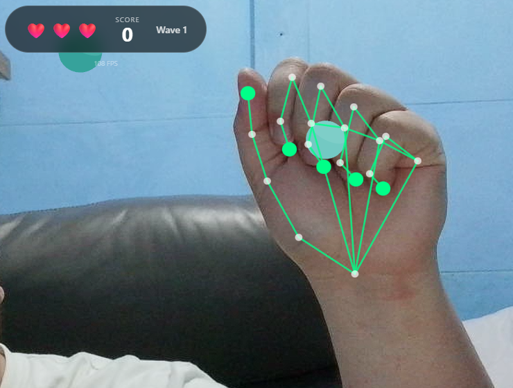 This repository is that experiment: a hand-tracking mini game built with MediaPipe Hands for real-time landmarks, React for UI structure and state, React Three Fiber + Three.js for rendering, and React Three Rapier for physics collisions and sensors.