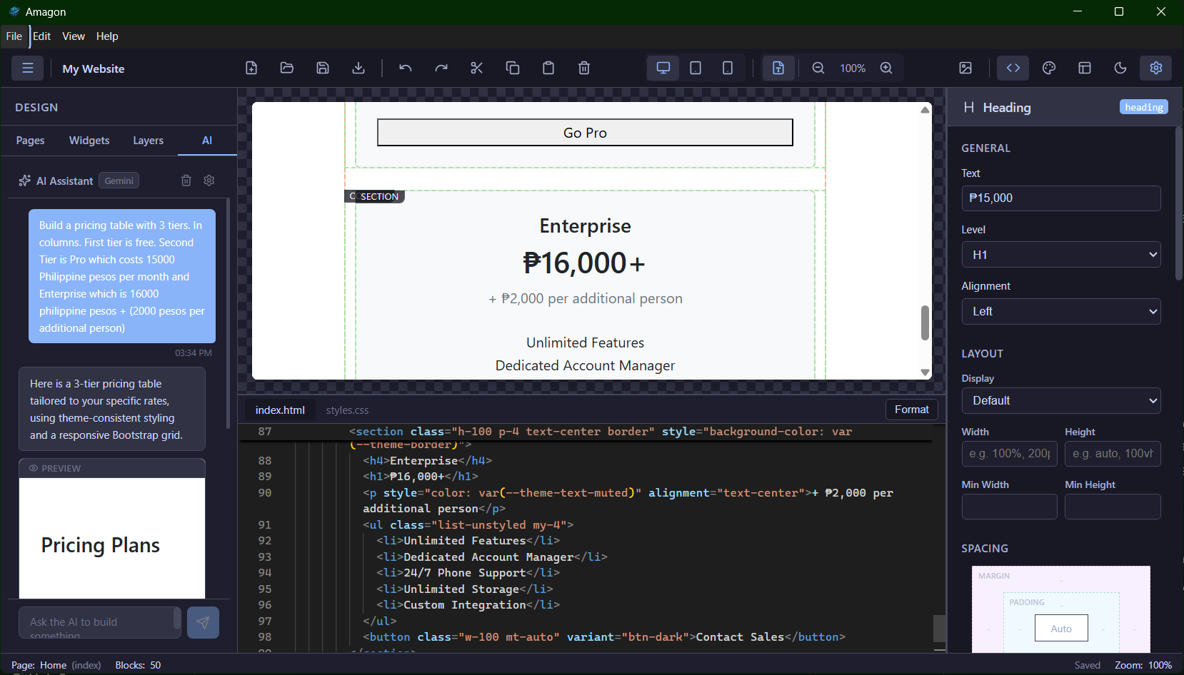 On top of that, I wanted bidirectional sync between the visual canvas and the code editor, undo/redo with a 50-step history, multi-page project management, a theme system with CSS variables, export to clean standalone HTML, and (because why not) a built-in AI assistant that understands the block structure and can generate components from natural language.